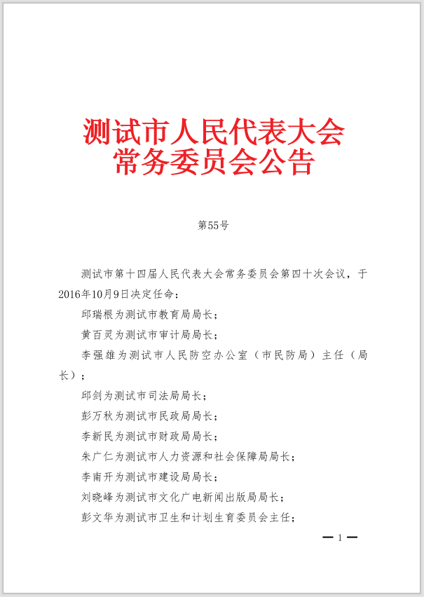 official.addContent("测试市第十四届人民代表大会常务委员会第四十次会议,于2016年10月9日决定任命:");