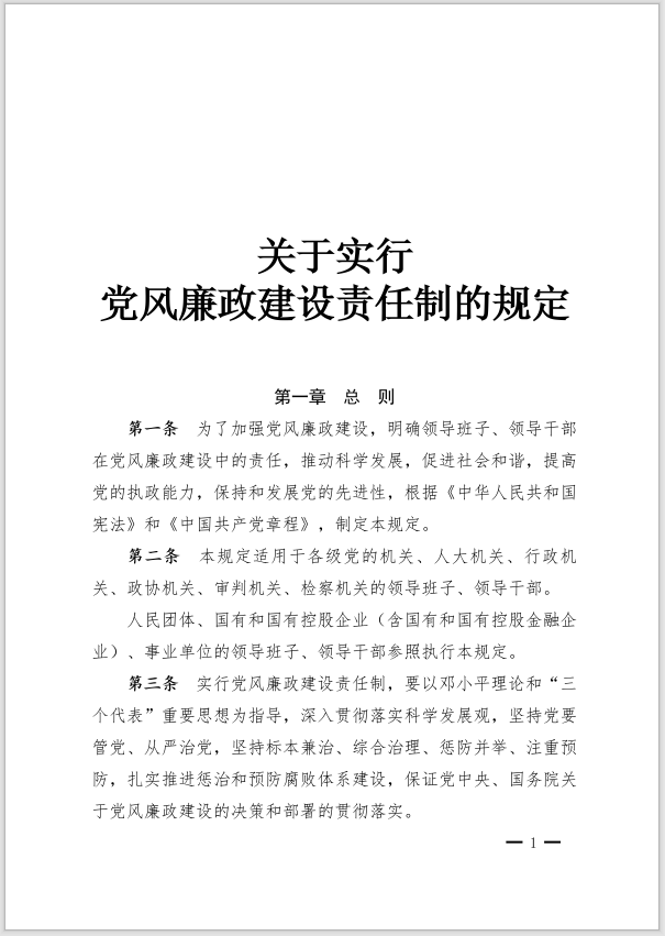 p.add("第一条", " 为了加强党风廉政建设,明确领导班子、领导干部在党风廉政建设中的责任,推动科学发展,促进社会和谐,提高党的执政能力,保持和发展党的先进性,根据《中华人民共和国宪法》和《中国共产党章程》,制定本规定。");