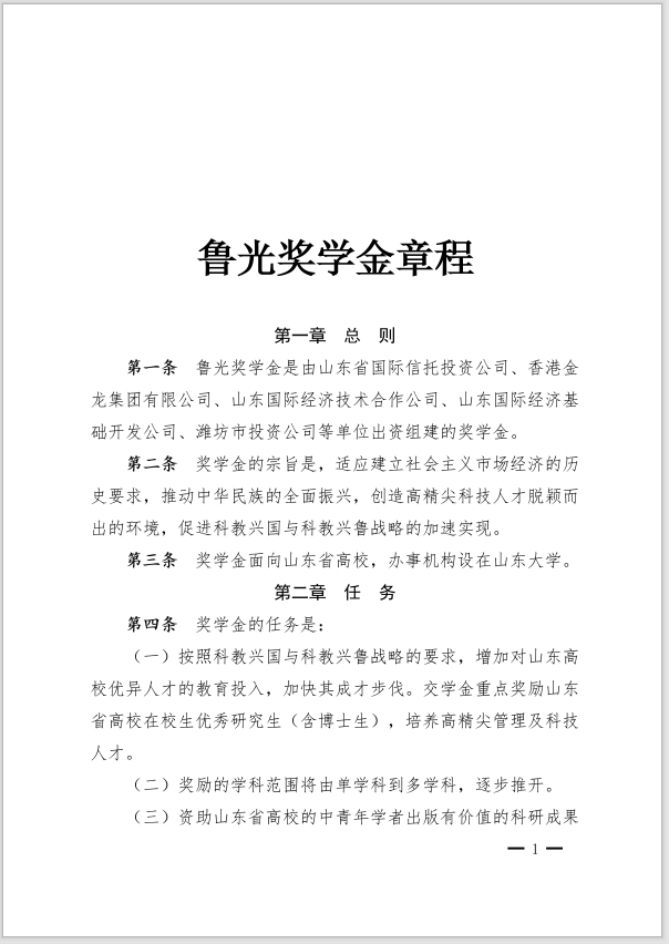p.add("第一条", " 鲁光奖学金是由山东省国际信托投资公司、香港金龙集团有限公司、山东国际经济技术合作公司、山东国际经济基础开发公司、潍坊市投资公司等单位出资组建的奖学金。");