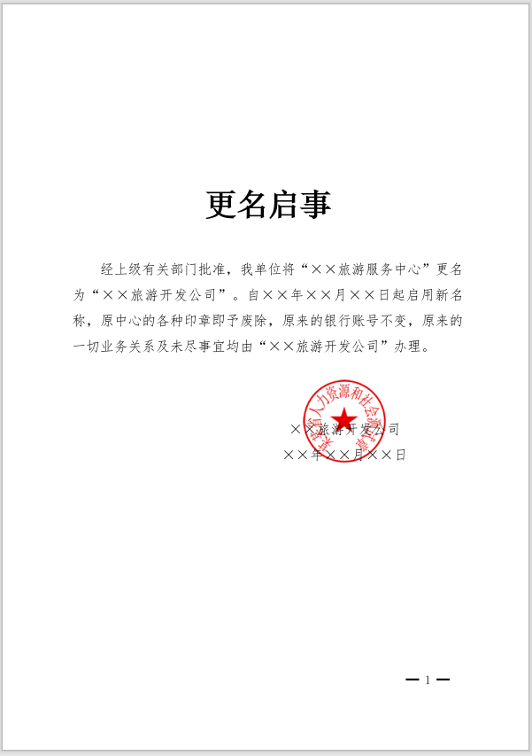 official.addContent("经上级有关部门批准,我单位将“××旅游服务中心”更名为“××旅游开发公司”。自××年××月××日起启用新名称,原中心的各种印章即予废除,原来的银行账号不变,原来的一切业务关系及未尽事宜均由“××旅游开发公司”办理。");