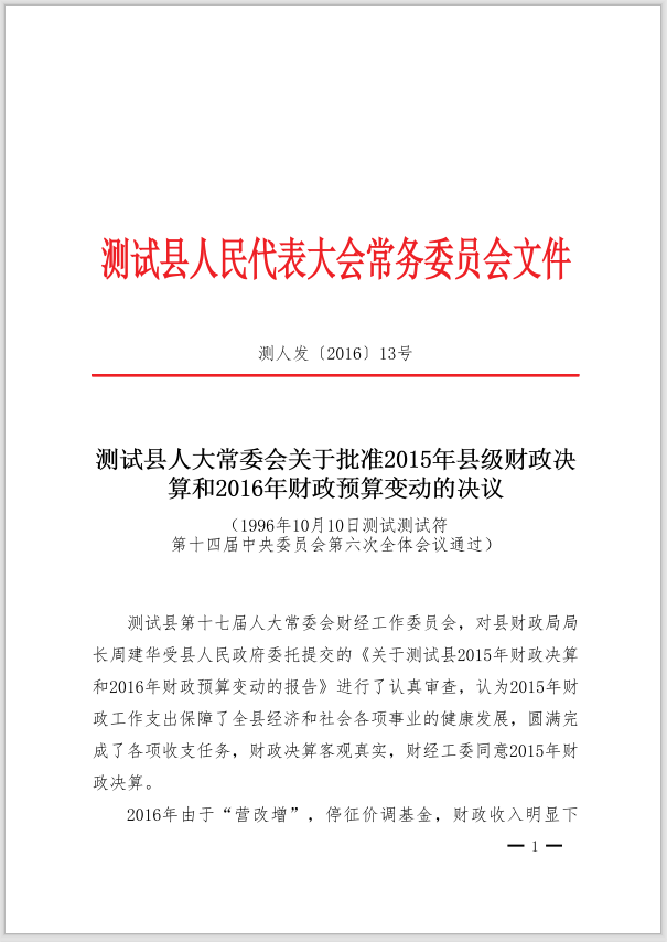 p.add(new Text("结合审计工作报告和县人大常委会财经工作委员会的审查意见,经会议研究,决定批准《关于测试县2015年财政决算和2016年财政预算变动的报告》,批准测试县2015年县级财政决算,批准2016年的财政预算变动。"));