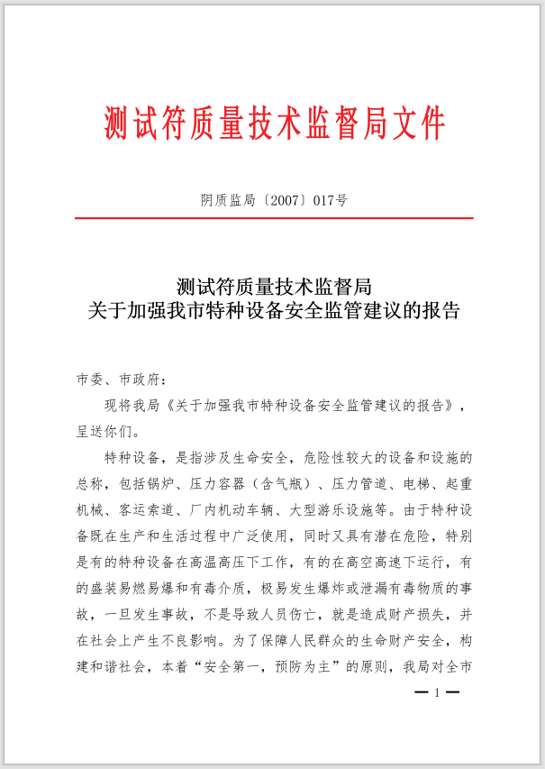 titles.add("关于加强我市特种设备安全监管建议的报告");