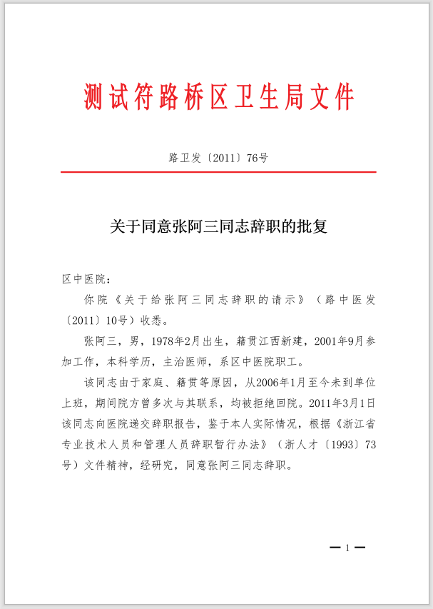 official.addContent("该同志由于家庭、籍贯等原因,从2006年1月至今未到单位上班,期间院方曾多次与其联系,均被拒绝回院。2011年3月1日该同志向医院递交辞职报告,鉴于本人实际情况,根据《浙江省专业技术人员和管理人员辞职暂行办法》(浙人才〔1993〕73号)文件精神,经研究,同意张阿三同志辞职。");